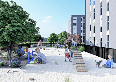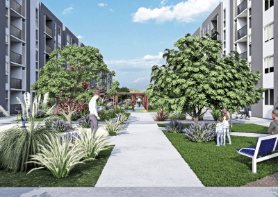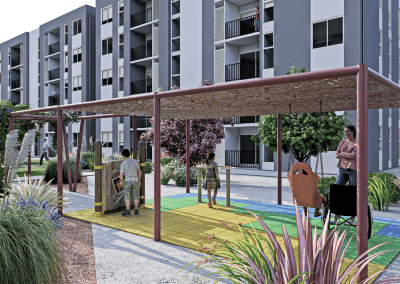 Proyecto consiste en 8 torres habitacionales de 5 pisos, 160 departamentos intermediados por áreas verdes, equipamiento, zona de mascotas, y parrón conectado por un eje central del cual se desprenden diferentes tipos de juegos. 1 local comercial para la comunidad, portería, sala de administración, paisajismo y riego por goteo. 96 bodegas, 160 estacionamientos de uso habitacional, de los cuales 2 son para discapacitados y 12 estacionamientos de uso comercial de los cuales 2 para discapacitados. 82 estacionamientos de bicicletas de uso habitacional y 6 para uso comercial. Cuenta con sistema de eficiencia energética.