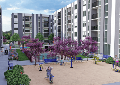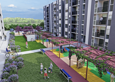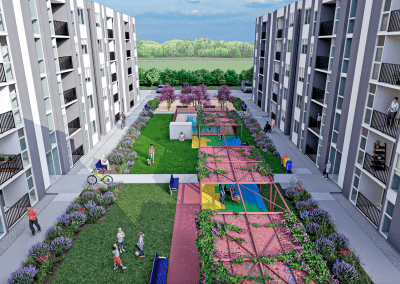 Proyecto consiste en 7 torres habitacionales de 5 pisos, 140 departamentos intermediados por áreas verdes equipadas, zonas de esparcimiento y piscina conectados por un eje central. Strip center con 14 locales comerciales, portería, sala multiuso, paisajismo y riego por goteo, estacionamientos asfaltados. 84 bodegas, 140 estacionamientos de uso habitacional, de los cuales 2 son para discapacitados y 25 estacionamientos de uso comercial de los cuales 1 es para discapacitados. 14 estacionamientos de bicicletas de uso habitacional y 10 unidades para uso comercial.